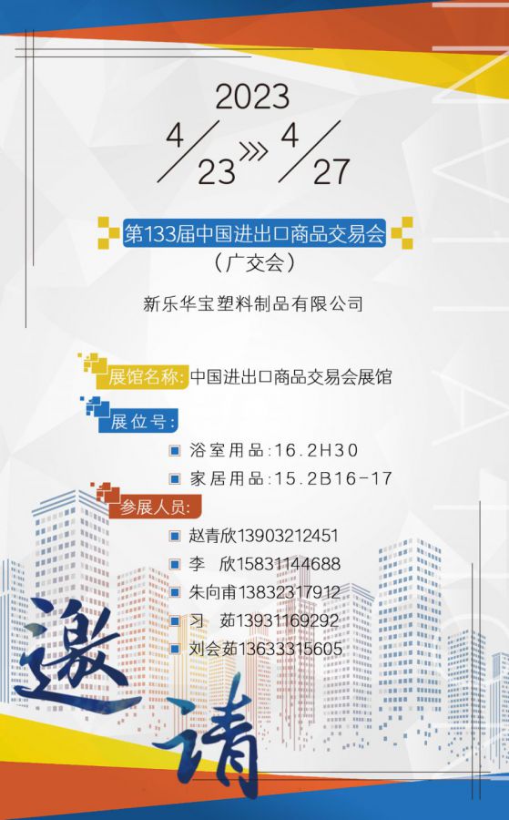 廣交世界,互(hù)利天下,新樂華寶塑料製品二期展位號:浴室用品16.2H30 /家居用品(pǐn)15.2B16-17 上一個:2023第(dì)16屆寧波國際塑料橡膠工業展覽會 下(xià)一個:叮咚(dōng)丨(shù)新樂華寶塑料製品有限公司3月份展會速遞