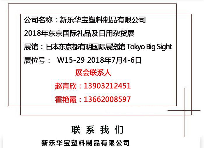 新樂華寶|期待您參觀2018年東(dōng)京國際禮品及(jí)日用雜貨展|7月(yuè)4-6日| W15-29 上一個(gè):新樂華寶|期待您參觀2018年德國法(fǎ)蘭克(kè)福展|6月30日(rì)-7月(yuè)3日| 9.2 A41D 下一個:中國消(xiāo)費(fèi)品(俄羅斯)品牌(pái)展-莫斯科